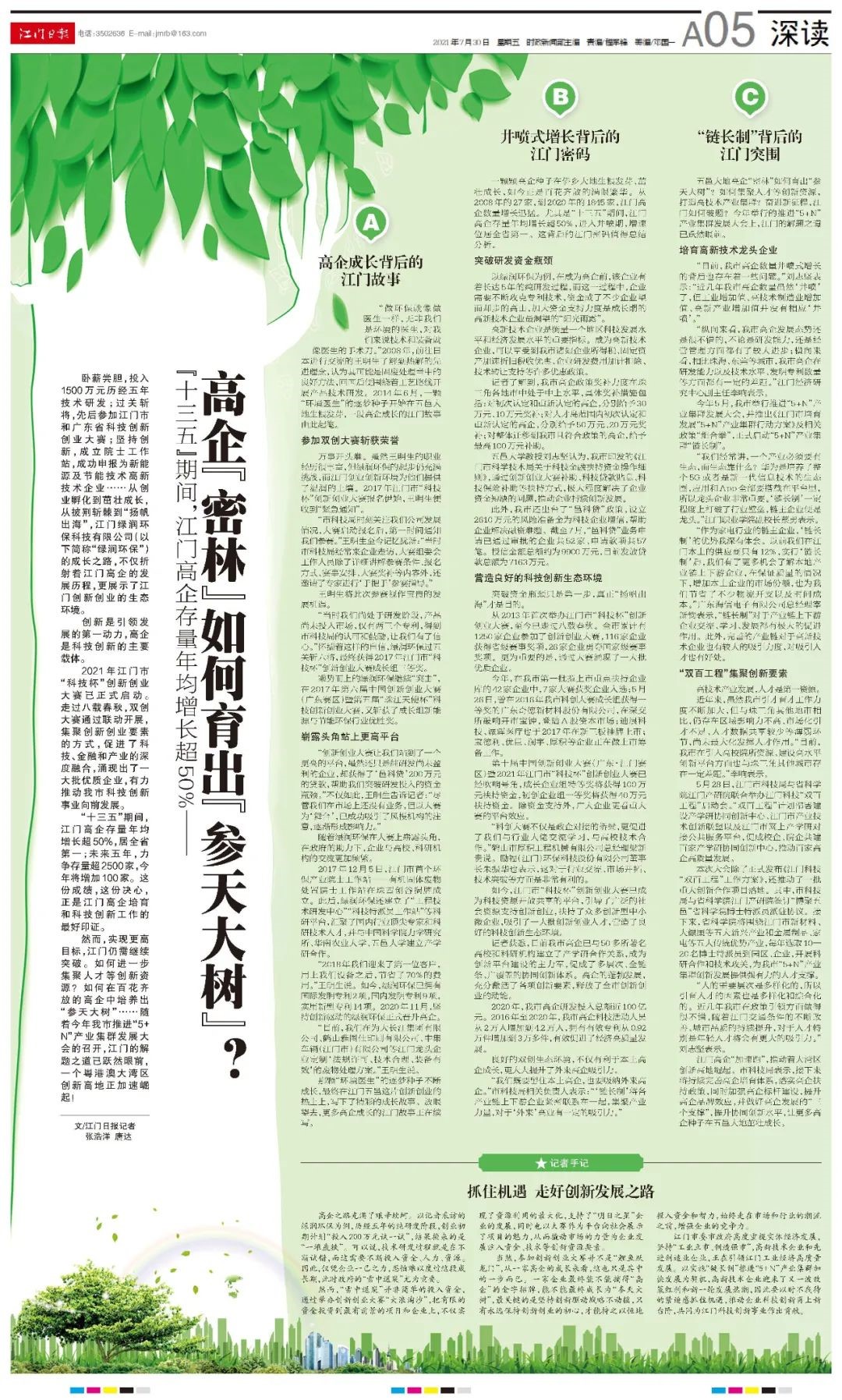 臥薪嘗膽,投入1500萬元?dú)v經(jīng)五年技術(shù)研發(fā);過關(guān)斬將,先后參加江門市和廣東省科技創(chuàng)新創(chuàng)業(yè)大賽;堅(jiān)持創(chuàng)新,成立院士工作站,成功申報(bào)為新能源及節(jié)能技術(shù)高新技術(shù)企業(yè)……從創(chuàng)業(yè)孵化到茁壯成長,從披荊斬棘到“揚(yáng)帆出海”,江門綠潤環(huán)??萍加邢薰荆ㄒ韵潞喎Q“綠潤環(huán)保”)的成長之路,不僅折射著江門高企的發(fā)展歷程,更展示了江門創(chuàng)新創(chuàng)業(yè)的生態(tài)環(huán)境。創(chuàng)新是引領(lǐng)發(fā)展的第一動(dòng)力,高企是科技創(chuàng)新的主要載體。
